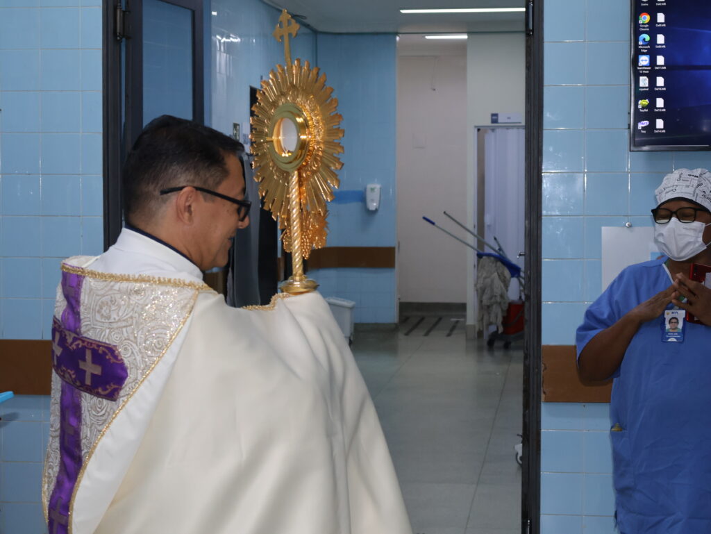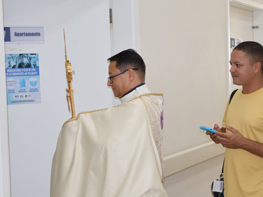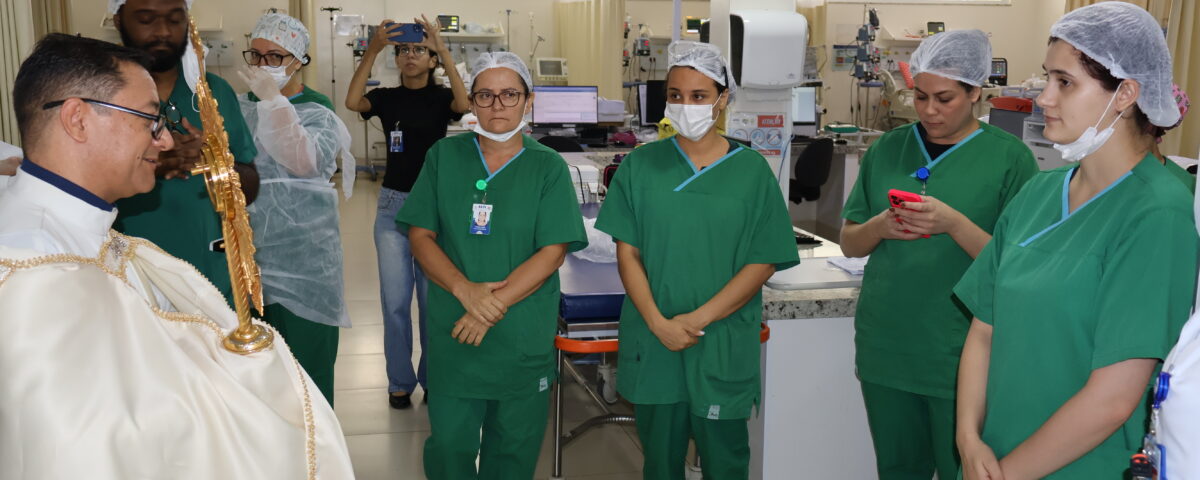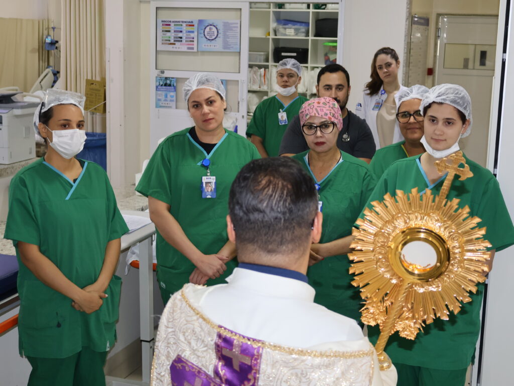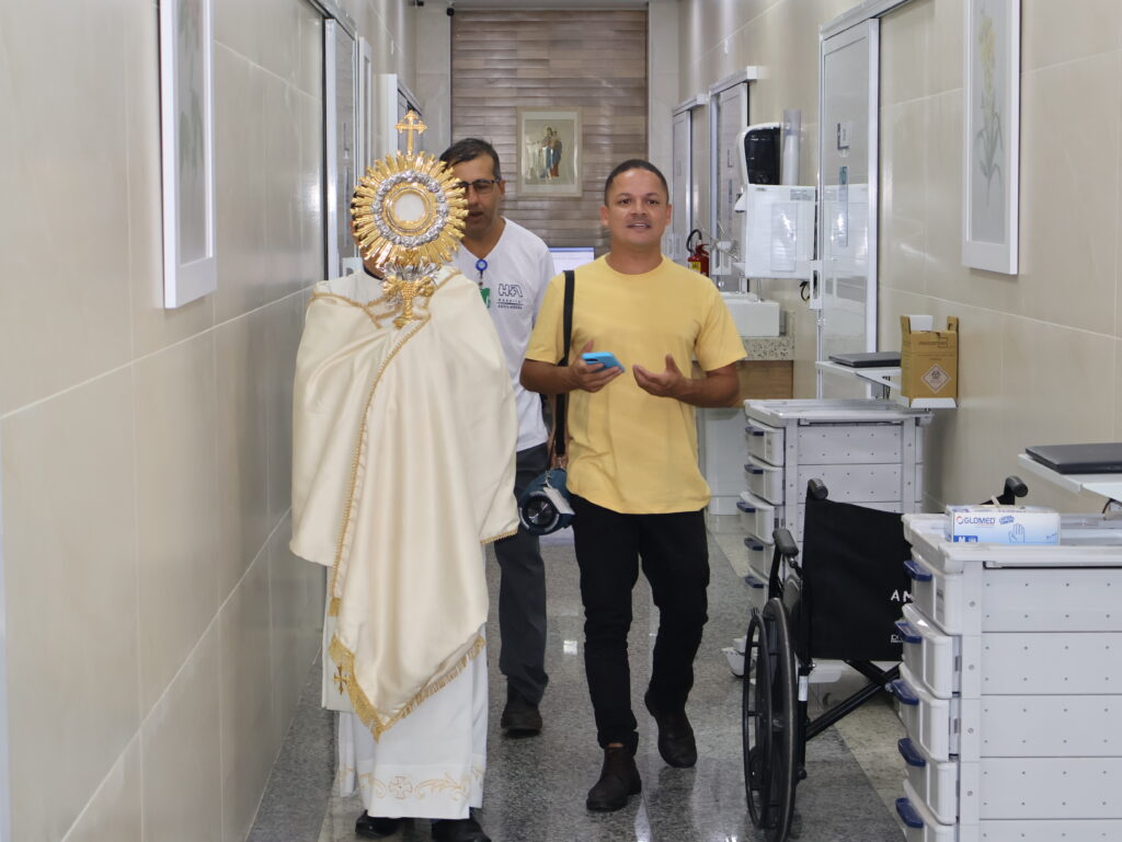 Durante o percurso, profissionais interromperam brevemente suas atividades para acompanhar o momento de oração, enquanto pacientes, em seus leitos, receberam a passagem com gestos de fé e acolhimento. O momento contou ainda com o acompanhamento de Lucas Gomes, que conduziu cânticos ao longo do trajeto, contribuindo para intensificar o ambiente de espiritualidade e recolhimento.