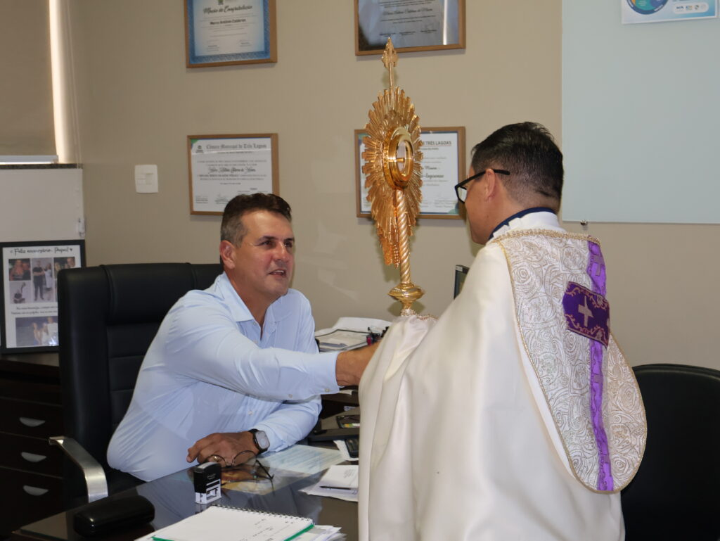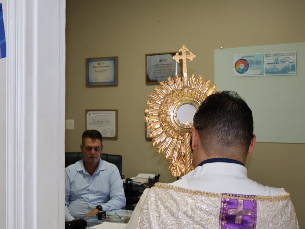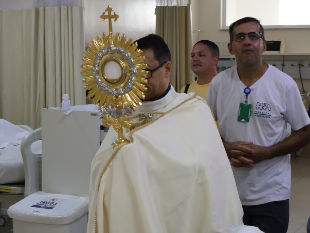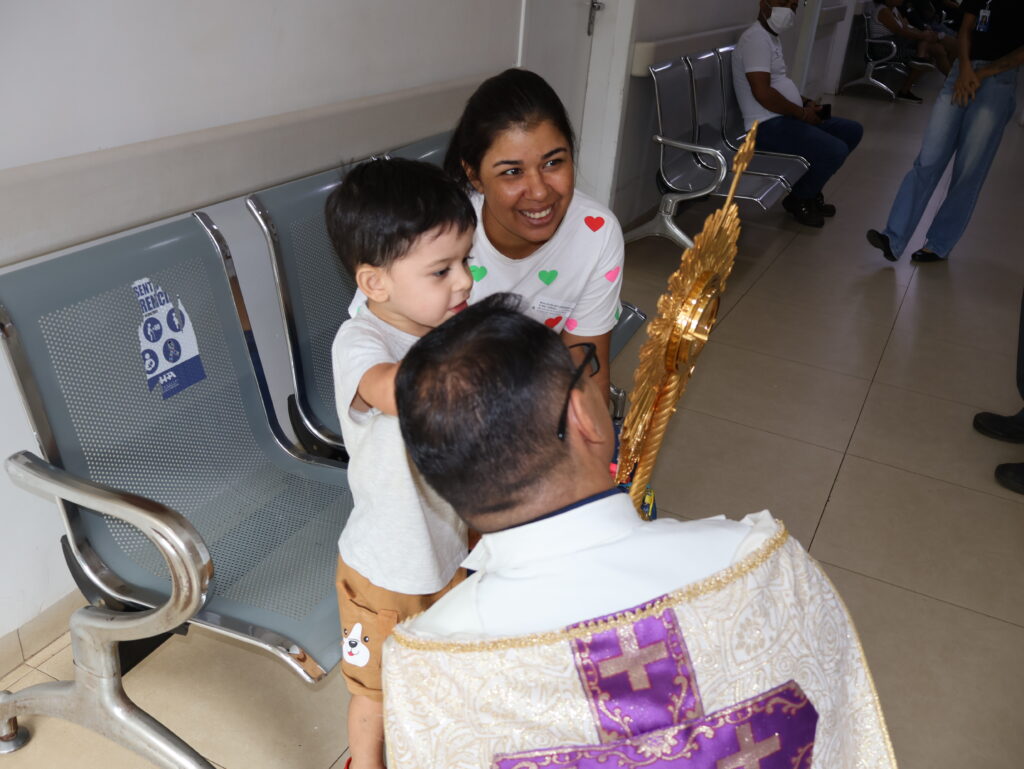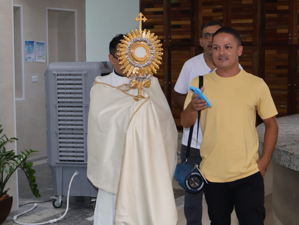 Durante o percurso, profissionais interromperam brevemente suas atividades para acompanhar o momento de oração, enquanto pacientes, em seus leitos, receberam a passagem com gestos de fé e acolhimento. O momento contou ainda com o acompanhamento de Lucas Gomes, que conduziu cânticos ao longo do trajeto, contribuindo para intensificar o ambiente de espiritualidade e recolhimento.