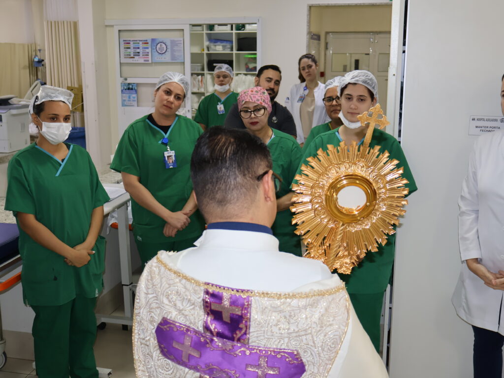 Na tarde desta sexta-feira, em abertura à Semana Maior, o hospital promoveu o passeio do Santíssimo Sacramento pelos seus corredores. A ação, marcada por um clima de silêncio, respeito e devoção, levou a presença e a bênção a pacientes e colaboradores, alcançando diferentes setores da instituição.